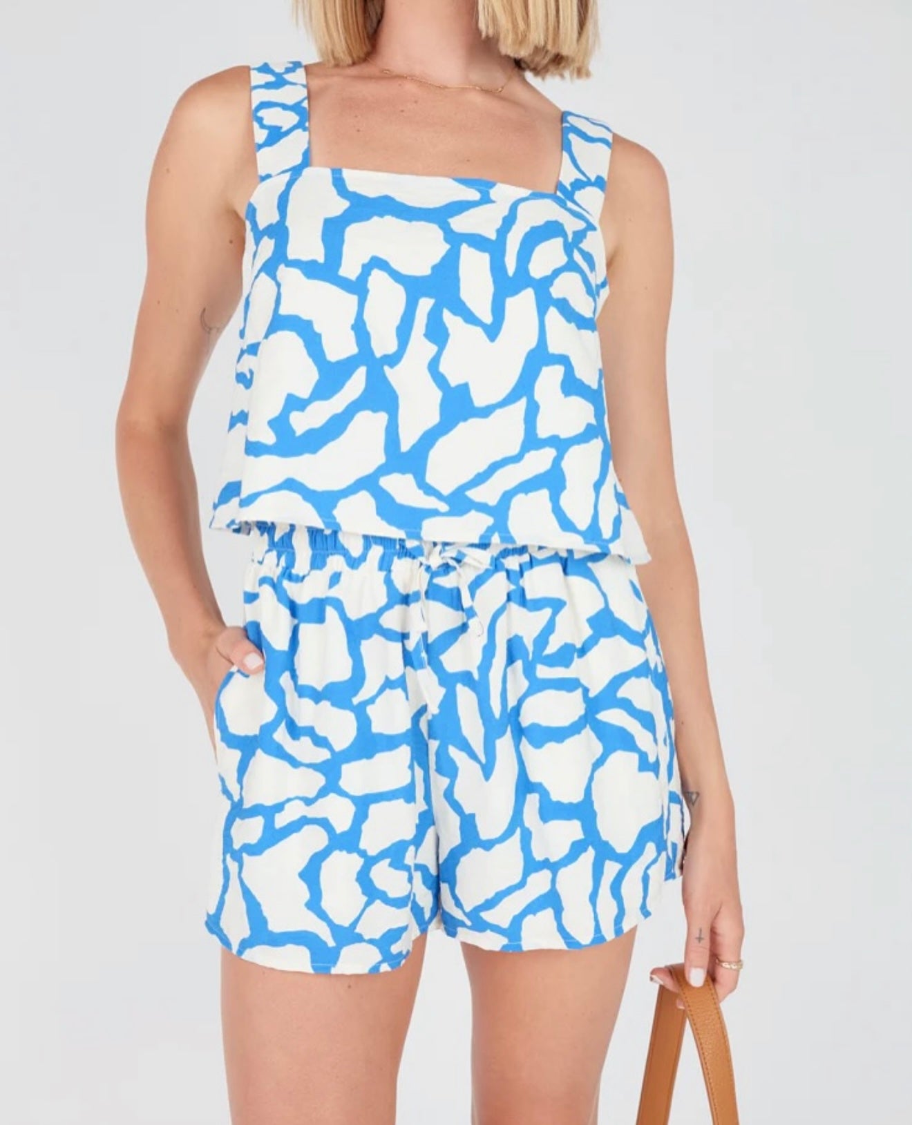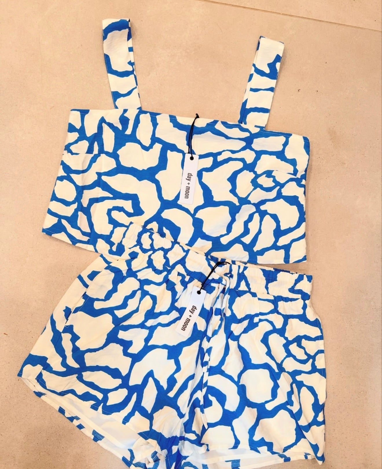 Printed Day+Moon blue and cream tank/shorts set. Shorts have elastic tie waist! NWT! Retails for $64