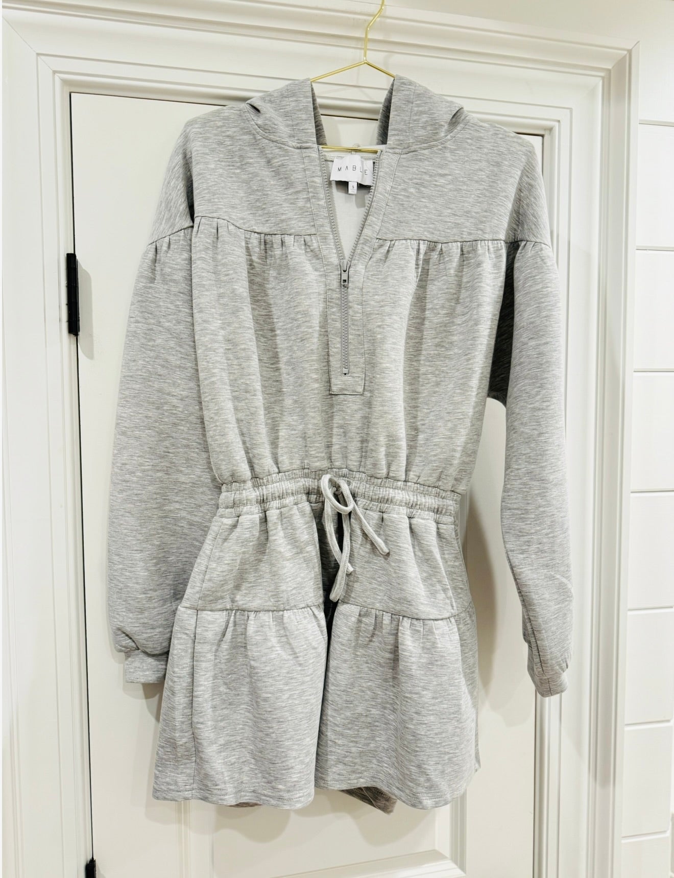 Grey ruffle bottom romper with zip and hood. Brand is Mable! In great condition worn once!