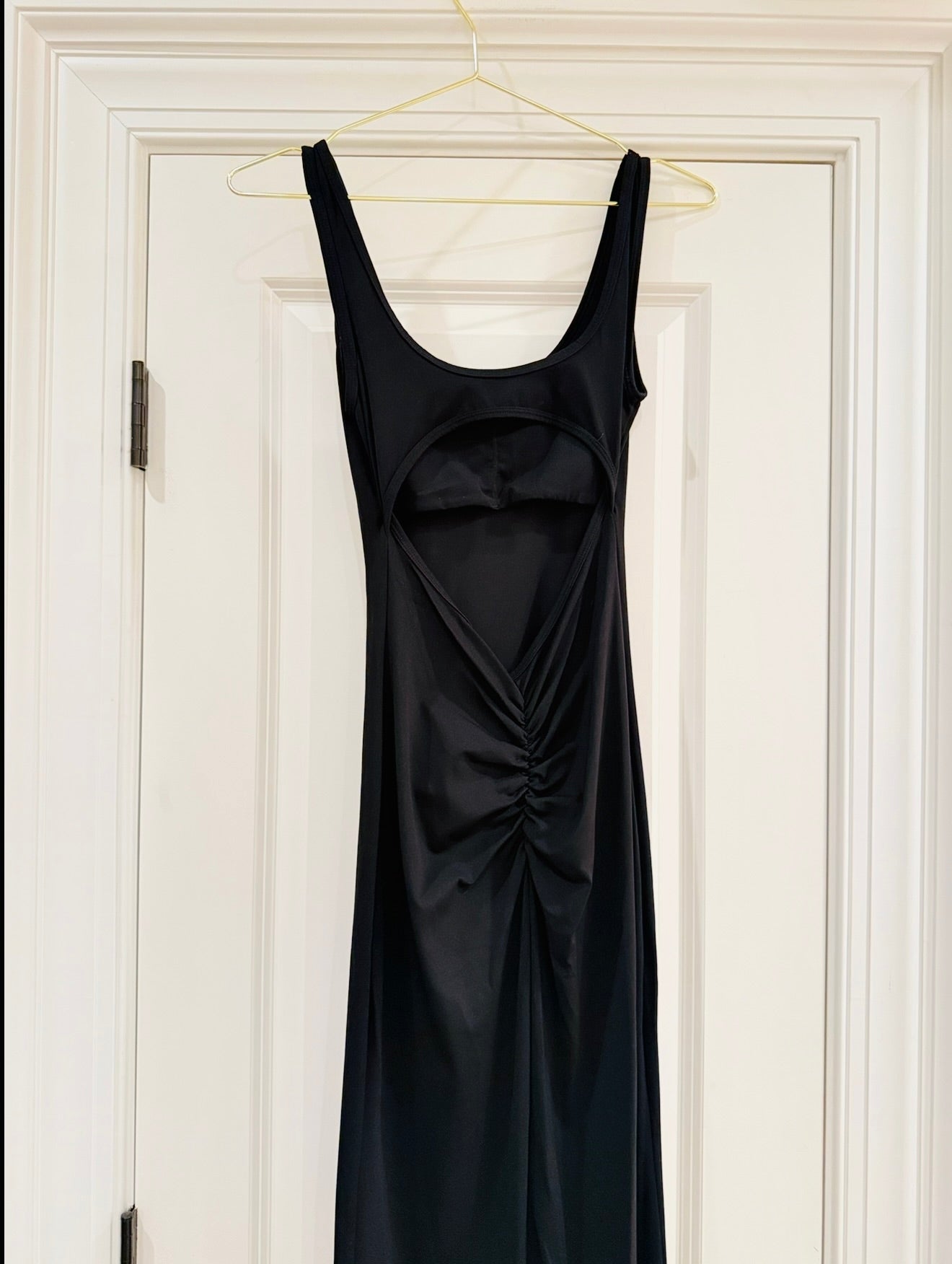 Black spandex one piece jumper with open back and cinched detail. Flare bottom. Great for layering sweatshirts over! In great condition!